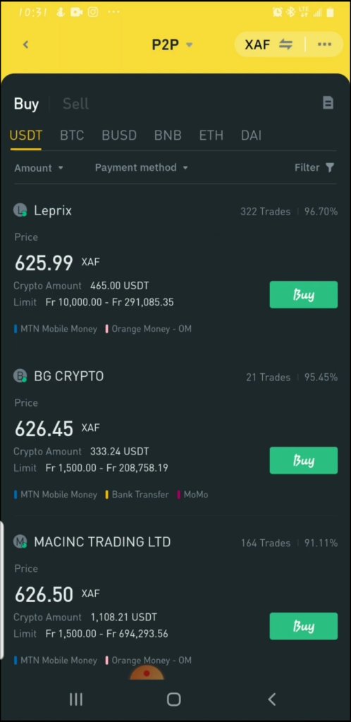 Binance P2P prend en charge environ 150 méthodes de paiement et plus de 70 devises locales. En Afrique, vous pouvez obtenir des méthodes de paiement comme le virement bancaire, MTN Mobile money, Orange mobile money, qui sont les méthodes de paiement de base que nous utilisons quotidiennement dans notre société. En autre pour acheter des crypto-monnaies rapidement et en toute sécurité, téléchargez l’application mobile Binance, si vous n’avez pas encore de compte Binance, créez un compte gratuit ici https://bit.ly/3Bog05s vérifiez votre compte et suivez les étapes ci-dessous