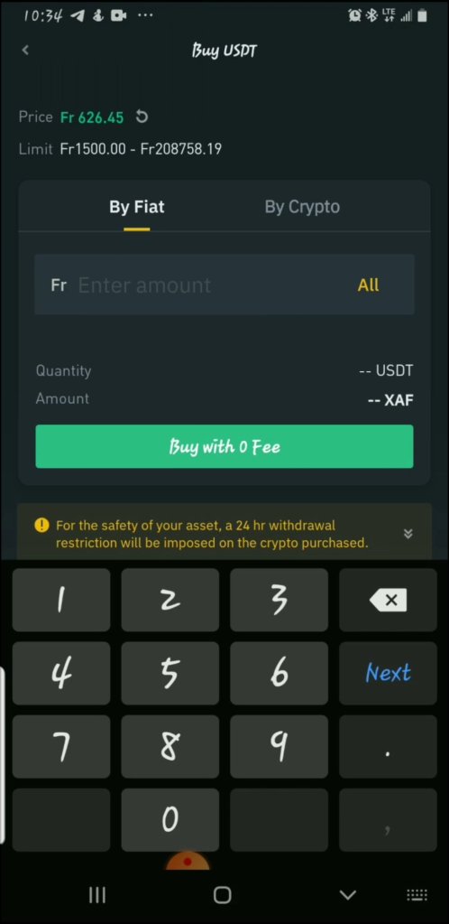 - à partir de là, vous devrez saisir le montant que vous souhaitez soit en crypto soit en fiat. Dans tous les cas, le montant s’affichera ci-dessous. alors vous pouvez ensuite acheter sans frais.
