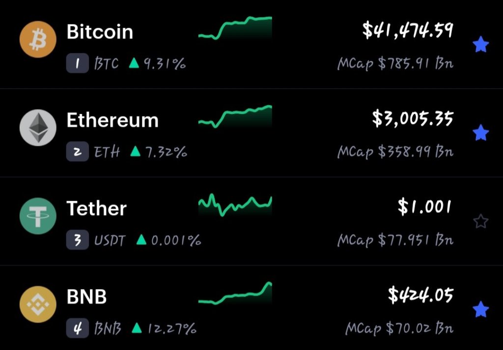 - Bitcoin (BTC): As of the time of writing, the 24h price trend of bitcoin shows that it starts at a Low of $37k and hit a High or $41k as shown on the Binance platform.