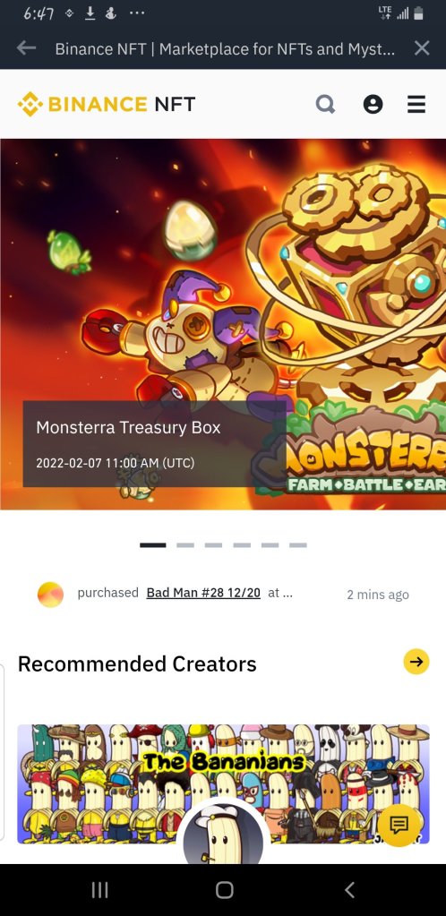 Pour accéder au Binance NFT Marketplace, vous devrez créer un compte Binance ICI et le vérifier. Vous pouvez accéder au NFT Marketplace depuis le site Web de Binance www.binance.com ou via leur application mobile que vous pouvez obtenir depuis votre Google play store ou votre App store.