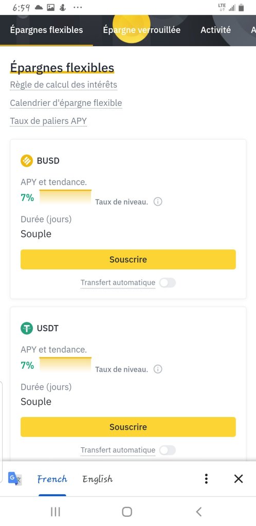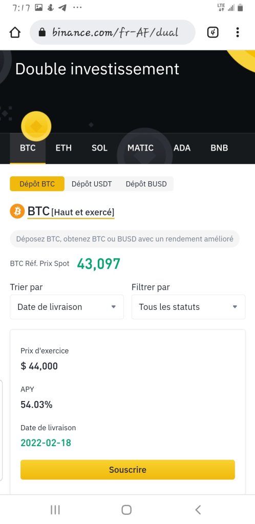 Le retour sur vos économies dépendra de l’évolution du marché de la crypto depuis le jour où vous avez investi votre crypto dans Binance Dual Investment. Lorsque le produit expire, vous pouvez choisir de régler avec l’un des actifs parmi les deux options (comme BTC ou BUSD). Il offre des revenus flottants non garantis, vous pouvez obtenir les revenus les plus élevés possibles tout en satisfaisant vos besoins de gestion des risques liés aux actifs numériques.