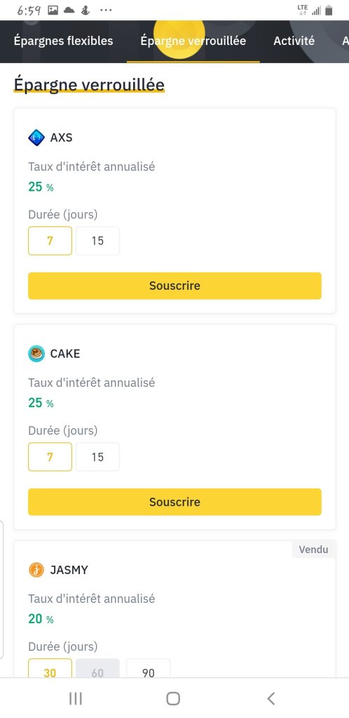 - Des économies: Donc, l’un des meilleurs moyens de gagner de l’argent consiste à épargner. Elle propose deux types de produits – l’Epargne Flexible et l’Epargne Fixe. Semblable au dépôt à vue d’une banque, vous pouvez déposer votre crypto et gagner des intérêts quotidiens sur vos fonds dormants. L’épargne flexible vous permet de racheter vos actifs quand vous en avez besoin, tandis que l’épargne fixe vous oblige à déposer vos actifs pendant une période déterminée et en retour, vous gagnez un rendement plus élevé que l’épargne flexible. Veuillez noter que si vous retirez vos fonds à l’avance de l’épargne fixe, vous perdrez également les intérêts gagnés.