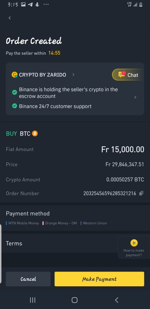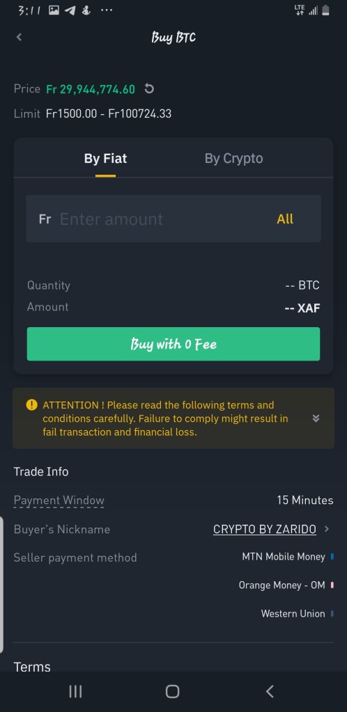 Choose the seller who has the best option you can go with. That is best price, amount available, and payment method which is convenient and at your disposal. Notice that you can also change the currency to reflect your local currency which is XAF (FCFA) in Cameroon. This is very important because it helps you interact with the prices very well and you won’t have to deal with the issue of converting currency or calculating much on a different currency. So once you choose the best seller for you, yoo can then input the amount of Bitcoin you want, (Crypto) or the amount of XAF (FCFA) which you wish to pay and equally, the amount to pay and the amount of bitcoin will be shown below as you input your figures.