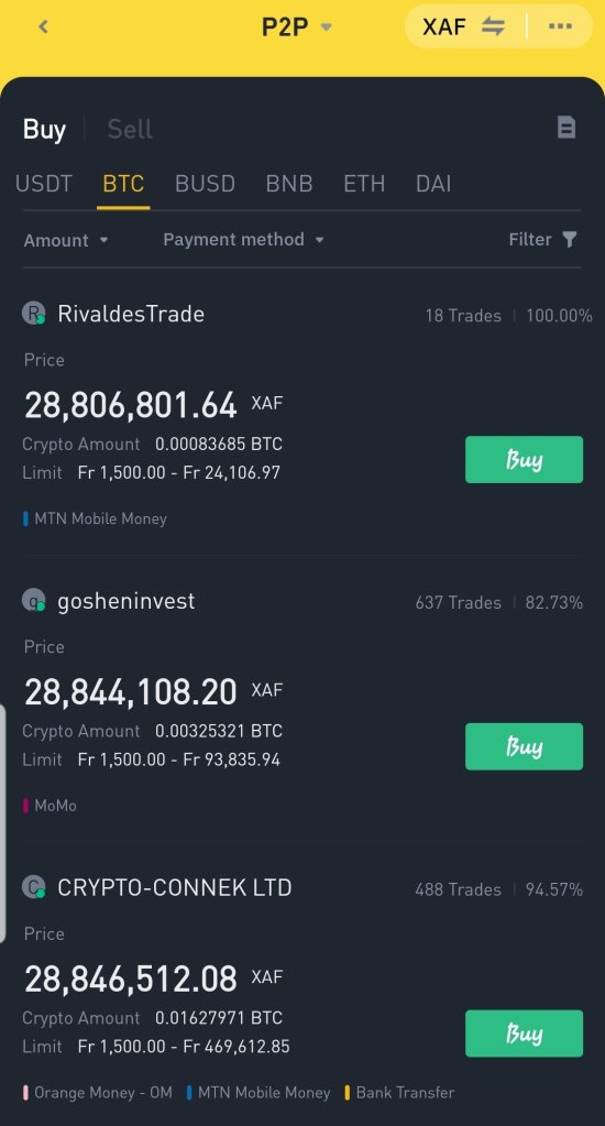 Once you are on the P2P platform, there are different sellers to buy from. You choose a seller base on the amount you want and the best rate. But also, depending on your preferred payment method. In other to easily use the platform, change the currency to your local currency like “NGN or XAF”. You can also find seller based on filter payment method.