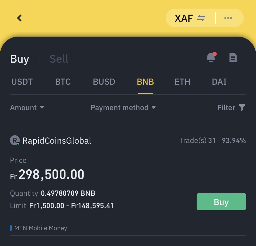 Vous pouvez facilement acheter des BNB via Binance P2P que vous pouvez utiliser votre devise locale et votre mode de paiement local pour acheter et vendre des crypto-monnaies sur Binance.