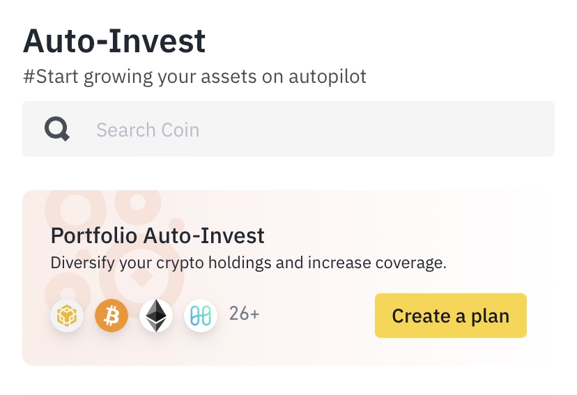Auto-Invest est un produit Binance Earn qui permet aux utilisateurs de gagner un revenu passif en achetant des cryptos via une stratégie de moyenne des coûts en dollars (DCA). Désormais, la dernière mise à jour d’Auto-Invest, la fonctionnalité de plan de portefeuille, permet à quiconque de personnaliser facilement son plan multi-crypto. Vous pouvez choisir la crypto-monnaie que vous souhaitez acheter régulièrement. Votre crypto achetée sera automatiquement déposée sur votre compte d’épargne flexible, afin que vous puissiez gagner un revenu passif avec vos investissements.