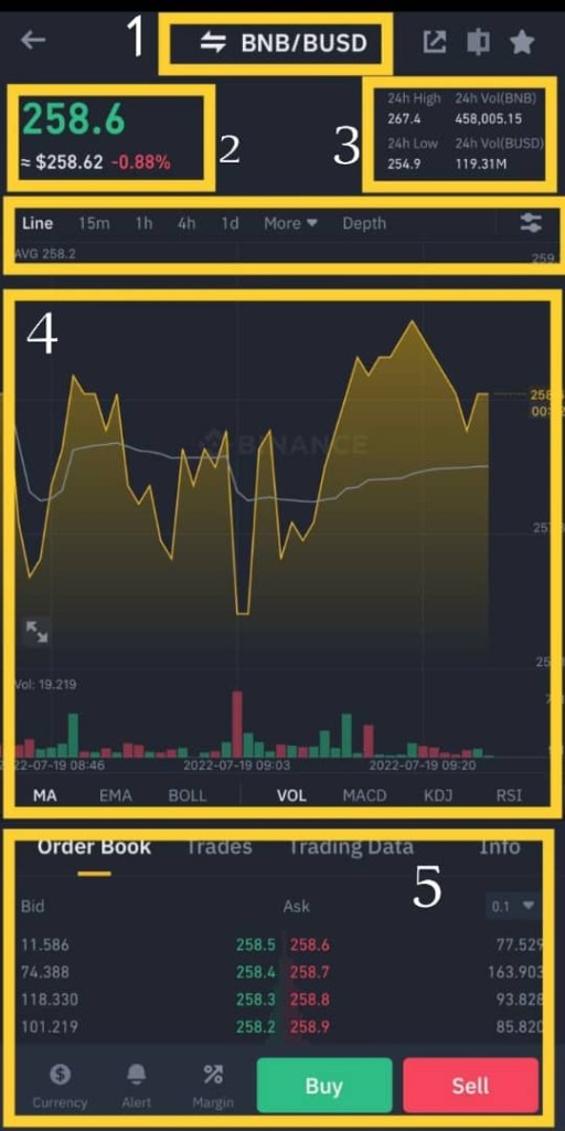 - La première partie que vous devez connaître est le numéro un, qui est la partie supérieure qui montre la paire de crypto-monnaie que vous souhaitez échanger. Il montre généralement comme BNB/BUSD. Lorsque vous cliquez dessus, vous pouvez modifier la paire de trading en recherchant la crypto que vous recherchez.